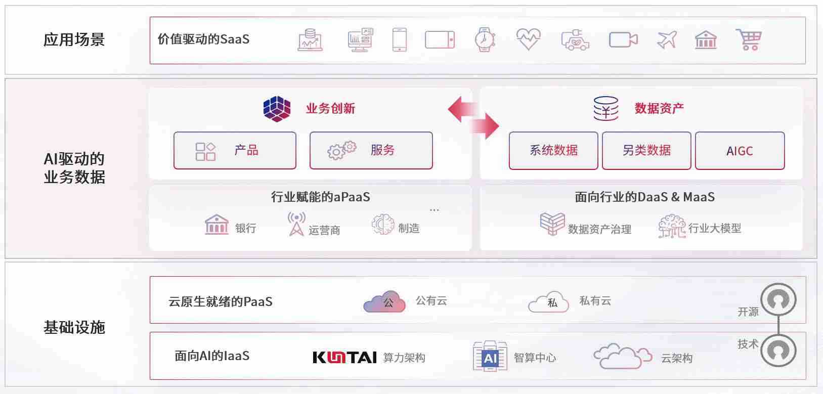 数字时代,,,,围绕企业数字化转型的关键要素,,,,尊龙旗舰厅数码开创性的提出数云融合战略和技术体系框架,,着力在云原生、、、数字原生、、、AI原生和信创产业上架构产品和服务能力,,,为处在不同数字化转型阶段的快消零售、、、、汽车、、、金融、、医疗、、、、政企、、教育、、运营商等行业客户提供泛在的敏捷IT能力和融合的数据驱动能力,,,,构建跨界融合创新的数字业务场景和新业务模式,,助力企业级客户建立面向未来的核心能力和竞争优势,,全面推动社会的数字化、、智能化转型升级。。。
